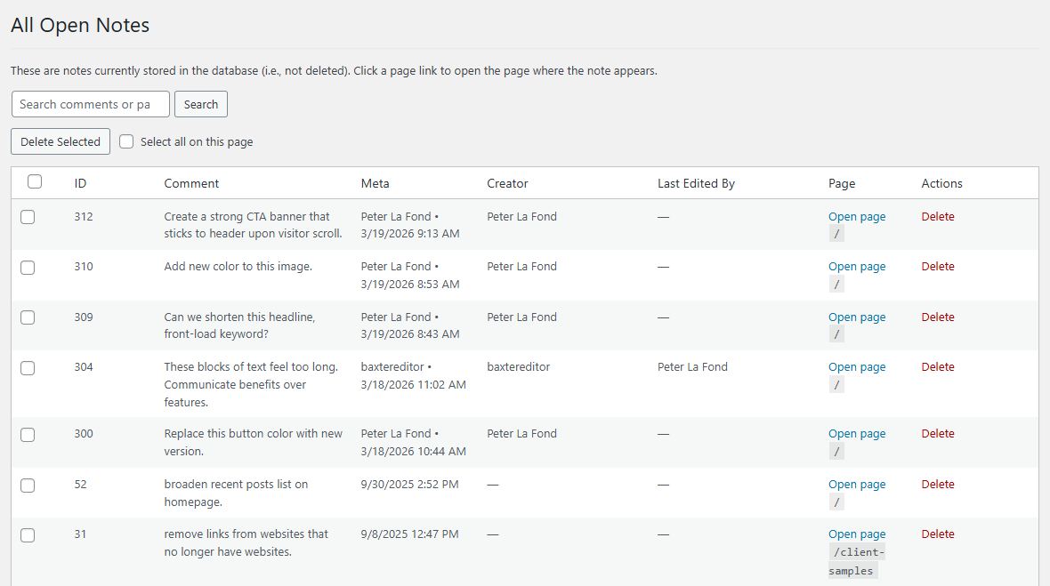 - Track open and completed tasks from the WordPress backend so notes don’t get lost or forgotten